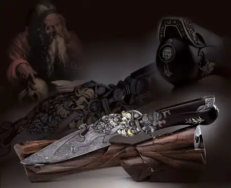 Дамаск, сталь, желтый и белый металлы, ценные сорта дерева (6 сортов).