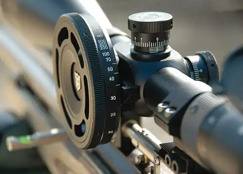 Большое колесо на прицеле помогает более точно навести прицел на резкость, или, если быть более точным, отстроить от параллакса. На ободе колеса спортсмен, как правило, указывает точные дистанции