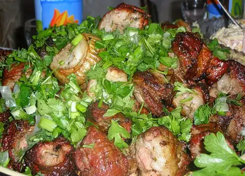 Кстати, само слово «шашлык» в русском языке оказалось и вовсе случайно. Это искаженное крымско-татарское слово «шиш» — «вертел», «шишлык» — «что-то на вертеле». В России такое мясо называли «верченым» — переворачиваемым на вертеле. «Царским кушаньям» и других памятниках XVI-XVII веков упоминаются «верченые» куры, утки, мясо и зайцы. В Армении шашлык называют «хоровац», а в Азербайджане — «кебаб», в Турции — «шиш-кебаб».Кебаб — это что-то вроде котлеты, с большим количеством мяты. Вся эта масса нанизана на деревянные палочки и запекается на углях. На Западе и в Америке «верченые» блюда превратились в «переворачиваемые» — там в обычае готовить мясо на решетке в жаровнях, именуемых «барбекю». В некоторых районах Африки местные аборигены делают шашлык из ливера. В Грузии для самых дорогих гостей делают «мцвади» на сухой виноградной лозе. Маленькие кусочки мяса на шампурах распространены и в Юго-Восточной Азии: Таиланде, Малайзии, Индонезии, — называются satay.