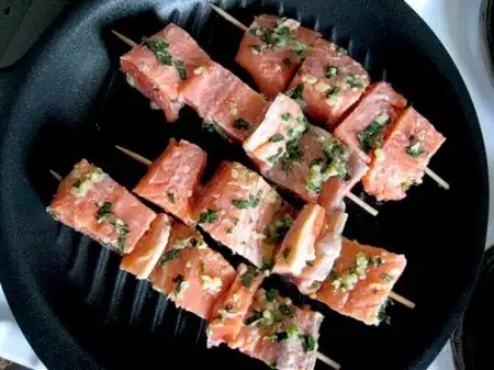 В Японии, Китае, Индонезии мясо одевают на шпажки (острые деревянные палочки), жарят во фритюре, потом окунают в соус и подают к столу. Хотя в Японии для приготовления шашлыков используют в первую очередь морепродукты («темпора»). На углях японцы готовят очень редко. Они считают, что уголь обладает свойством впитывать запахи, а когда его разжигают, он передает эти запахи продуктам. Поэтому японцы с шашлыком, приготовленным на открытом огне, обязательно едят маринованный имбирь — он отбивает посторонние запахи.