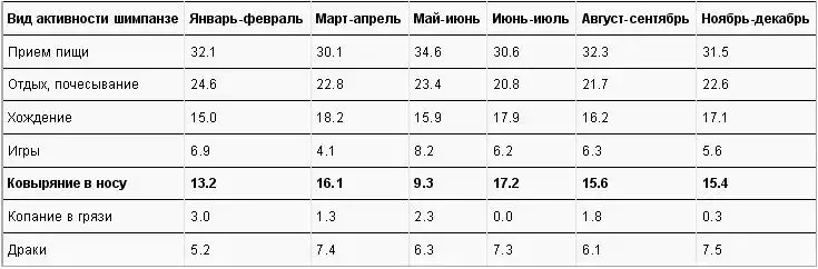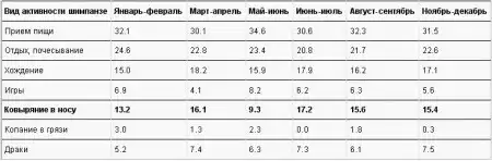 В этой статье-розыгрыше, в частности приводятся такие данные об активности шимпанзе (в процентах от общего времяпрепровождения):