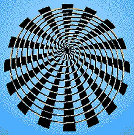 Эта иллюзия известна также под именем "ложная спираль" и "свитая веревка". Спираль формируется свитыми жилами (веревками) разного цвета и, на самом деле, представляет собой концентрические окружности.