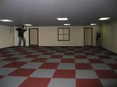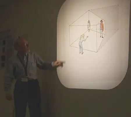 Комната Эймса была сконструированная художником и психологом Адельбертом Эймсом в 1946 году. Дальняя стена комнаты расположена не под прямым углом к боковым стенам, как это обычно бывает, а под очень острым углом к одной стене и, соответственно, под тупым углом к другой. Благодаря ложной перспективе, созданной в том числе узорами на стенах и полу (в данном случае - черно-белые клетки), наблюдатель воспринимает эту комнату прямоугольной. В результате оптической иллюзии, человек, стоящий в ближнем (к наблюдателю) углу такой комнаты, выглядит великаном, а находящийся в дальнем углу - карликом. При передвижении человека из одного угла в другой, создается ощущение, что он увеличивается в размерах или уменьшается.