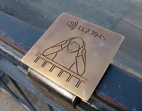 Таким необычным способом в уши людей транслируется "реконструкция" ужасной бомбардировки Дрездена 13-15 февраля сорок пятого. На это намекает единственная надпись на табличках: "13.2.1945".