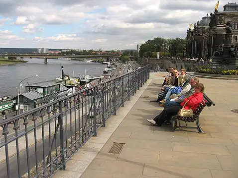 Перед глазами отдыхающих — великолепный вид на Эльбу и "Старый город". Неподалёку от данной площадки расположена и знаменитая церковь Frauenkirche. Её, если можно сказать, оригинал XVIII века был полностью уничтожен в ходе той знаменитой бомбардировки. Только в 2005 году инженеры и строители тщательно восстановили по её старинным чертежам.