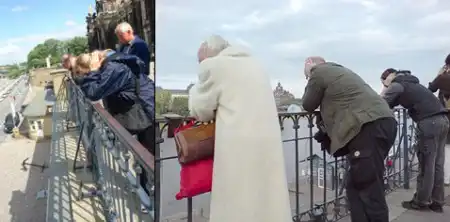 Необычные таблички на металлических перилах террасы Брюля, одной из исторических достопримечательностей Дрездена, призывают жителей города и туристов опереться о балюстраду локтями и закрыть уши ладонями. Если это проделать в точности как на картинке, можно услышать призрачное эхо войны.