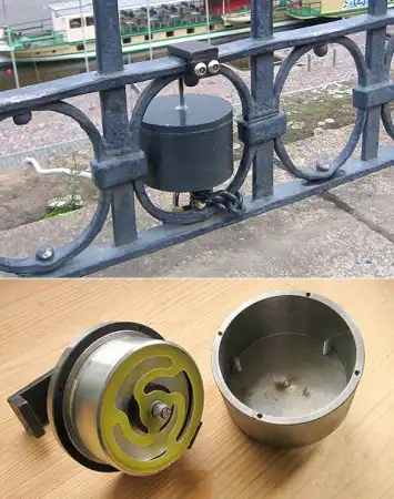 Что это за цилиндрики? Их четыре штуки, и они прочно прикреплены к решётке. Именно эти устройства и транслируют запись в виде вибрации, которая проходит через кости рук слушателей к их черепу и далее во внутреннее ухо.
