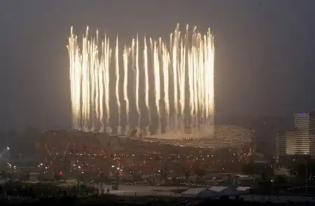 Салют над Пекинским Национальным Стадионом во время репетиции церемонии открытия Летней Олимпиады-2008.