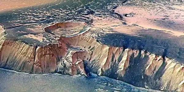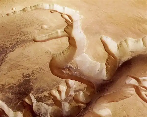 На фотографии, полученной аппаратом Mars Express, изображена область Echus Chasma (Каньон эха), там находятся самые большие запасы воды на Марсе.
