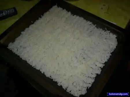 4. Вываливаем рис на смоченный противень и , опять же, режущими нежными дивжениями распределяем рис по противеню равномерным слоем примерно полсантиметра. Но если получится толще ничего страшного - просто роллы получатся более сытными и похожими на пельмени в кожуре.