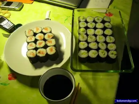теперь можно звать всю родню, хвастаться своим умением ( как я) и, мокая в соус, накладывая сверху вассаби, закусываю имбирем и т.д. употребл*ть ЭТО в пищу.