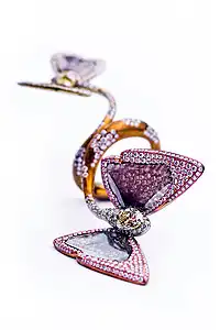 – кольцо из титана с разноцветными бриллиантами «Радужное небо»: кольцо будто парит в воздухе. Две бабочки – центральные элементы украшения – разлетаются в разные стороны, а их хвосты переплетены. Это уникальное кольцо не только колеблется вслед за рукой той, которая его носит, но и искрится более чем 700 белыми бриллиантами.