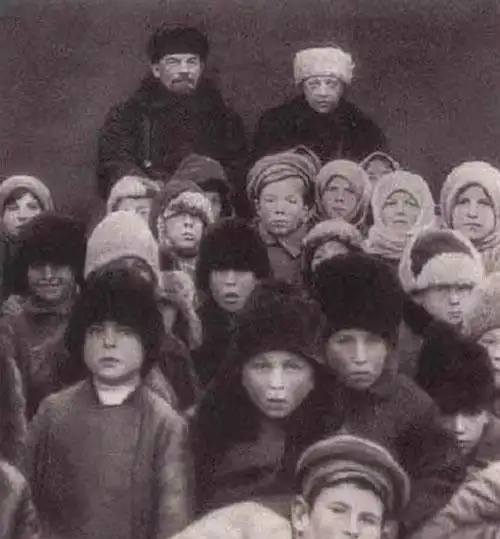 14 ноября, 1920… Ленин и его жена, Надежда Крупская, среди зажиточных мужиков (кулаков) из Кашино на открытии электростанции.