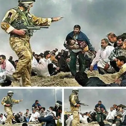Апрель, 2003… Эта фотография была создана из двух фотографий, которые вы видите под ней. За подделку фотографии английского солдата в Басре фотограф с 30-летним стажем был уволен из Los Angeles Times …