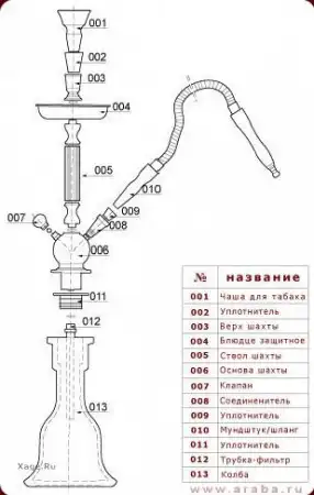 Искусные мастера изготовляли кальяны из хрусталя, золота и серебра, не говоря уже об обычных материалах. Уже несколько столетий форма кальяна почти неизменна. Состоит кальян из четырех частей: мундштук, верхушка, трубка и сосуд, заполняющийся водой.
