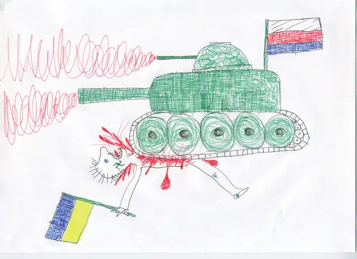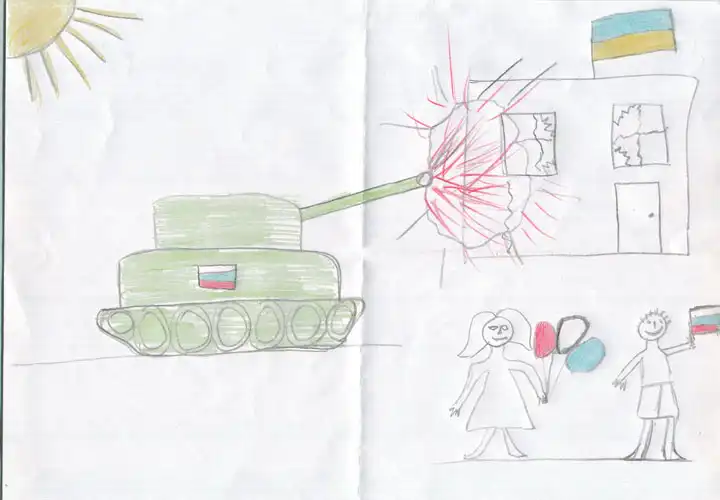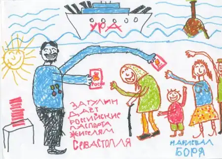 Наташа сообщает: "На картинке я фантазирую как нас будут освобождать от хахлов. Тут нарисована я и сосед Гена как мы вышли встречать освободителей. А мой брат Сашка плохо себя вёл и его оставили в доме".