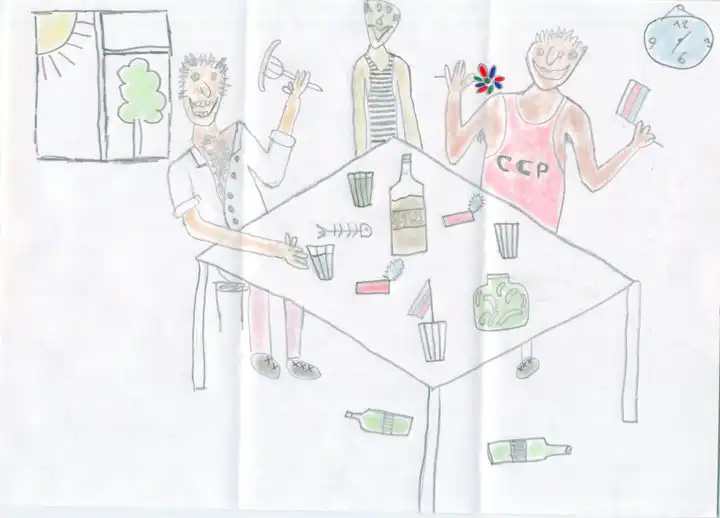 Лёша нам написал такое: "Папа очень обрадованный и другие дяди тоже очень обрадованные. Потому что наши победили непослушных грузинов и всех других плохих. Все очень радые. А Маринка наресовала только цветочек а я всё остальное"