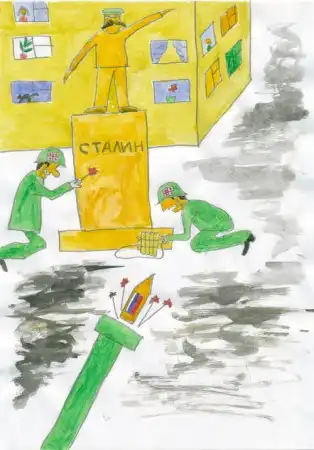 Алечка пишет нам: "Грузины плохие. Они решили взорвать памятник хорошему дедушке Сталину. Они уже зажгли спичку. Но русские войска уже подоспели на помощь и стреляют из пушки по врагам, чтоб они не взорвали памятник хорошему дедушке Сталину. А в доме на третьем этаже как бы сижу я и это как бы я вызвала российские войска. А рисовать памятник дедушке Сталину мне помогала бабушка Тая."