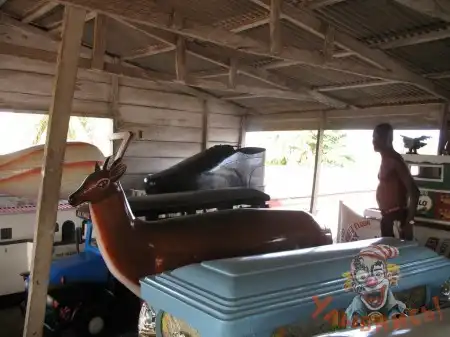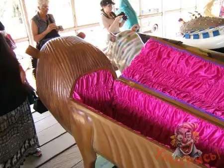 В племени Га (Ga) на побережье африканской страны Гана похороны часто превращаются в праздник. А все потому что умерших хоронят в гробах очень необычной формы. Бутылка Кока-Колы, бутылка пива, сигара, ананас, Мерседес-Бенц и другие экзотические предметы – это не рекламная акция, а реальность жаркой Африки.Дело в том, что племя Га верит, что покойники отправляются к новой жизни. И поэтому не стоит плакать, надо радоваться новой жизни! Поэтому они и используют для похорон такие яркие, цветастые и, не побоимся этого слова, веселые гробы.