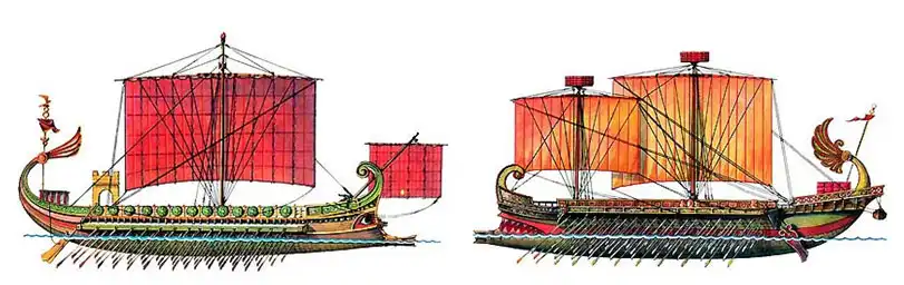 Основной тип боевого корабля Средиземноморья. Одни исследователи приписывают изобретение триремы финикийцам, другие называют коринфянина Аменокка. Главным оружием триремы был таран - продолжение килевого бруса. Водоизмещение судна достигало 230 т, длина - 45 м.