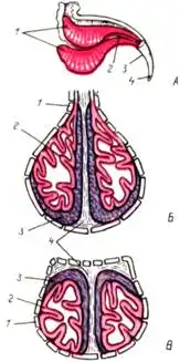 Ядовитый аппарат скорпионов: А — вскрытый тельсон; 1 — ядовитые железы; 2 — проток ядовитой железы; 3 — жало; 4 — отверстие протока; Б — продольный срез ядовитого аппарата; В — поперечный срез: 1 — хитиновая оболочка с порами; 2 — ядовитая железа; 3 — мышца-компрессор; 4 — соединительнотканный шов