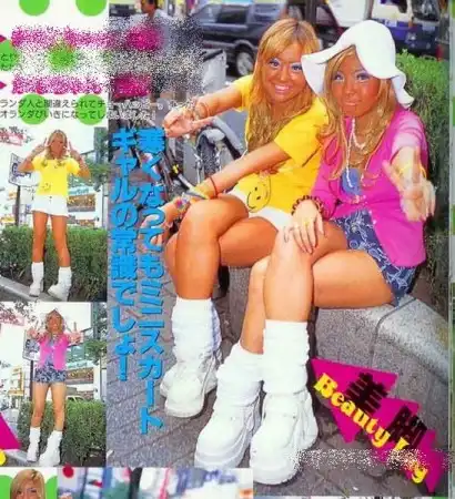 Для гангуро характерны глубокий загар и выжженные добела волосы. Также актуальными цветами волос являются оттенки оранжевого и серебристо-серые. Глаза гангуро подкрашивают белыми тенями и подводят белой подводкой. Нужно ли говорить, что губная помада тоже белого цвета? :) Также на глаза наклеиваются накладные ресницы, накладываются белые тени, а по всему лицу гангуро иногда размещают различные мелкие наклейки в виде сердечек-ромбиков и прочей мелочи, а также стразы. В общем,смахивает на наших эмо,но повеселее))