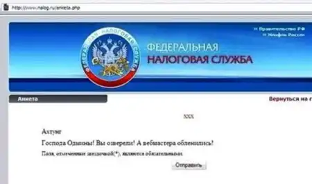 Любой мало-мальски продвинутый пользователь мог зайти на сайт, нажать кнопку "Отправить" и попасть на страницу администратора. С ее помощью все желающие могли творить в анкетировании что только захотят - поменять в нем слова, поставить веселые картинки. При этом все добавления выглядели как неотъемлемая часть странички налоговиков))))