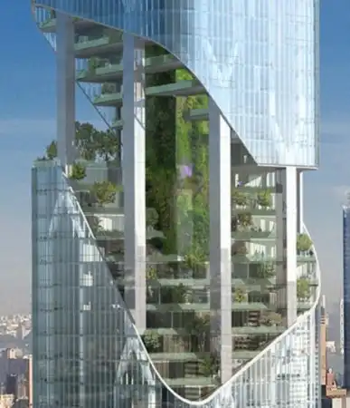 Потрясающий проект предложил архитектор Даниэль Либескинд (Daniel Libeskind) – который будет курировать реконструкцию Всемирного Торгового Центра в Нью-Йорке. На каждом этаже его кондоминиума высотой 900 футов будут располагаться сады, а внутри стеклянной трубки по центру здания будут подниматься ввысь вертикальные сады. Вырезы во внешней конструкции здания позволят и резидентам, и прохожим на улице наслаждаться прекрасными зелёными пейзажами.