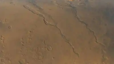 Облик этого полушария определила вулкани-ческая деятельность. Некоторые из равнин сплошь покрыты древними изверженными породами. Потоки жидкой лавы растекались по поверхности, застывали, по ним текли новые потоки. Эти окаменевшие "реки" сосредоточены вокруг крупных вулканов. На окончаниях лавовых языков наблюдаются структуры, похожие на земные осадочные породы. Вероятно, когда массы растапливали слои подземного льда, на поверхности Марса образовались достаточно обширные водоемы, которые постепенно высыхали. Взаимодействие лавы и подземного льда привело также к появлению многочисленных борозд итрещин.