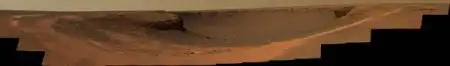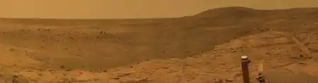 Марсоход Спирит взобрался на маленькое плато, известное как Основная База, и запечатлел открывшийся перед ним замечательный вид, показанный на этой картинке. Часть этого странного плато с плоской вершиной видна как светлый ландшафт на переднем плане панорамы. Слева на картинке, на расстоянии более восьми километров, находится холм Гриссома, а перед ним - покрытый камнями хребет Циолковского. Справа на расстоянии около 800 метров расположен холм Хазбенда, который Спирит уже исследовал. Это - самая высокая точка на всей панораме, показывающей вид на запад.