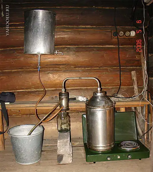 Если агрегат был большим и был способен выпускать самогон в больших количествах за небольшой промежуток времени, то чаще всего им пользовались все жители того небольшого пункта, где он располагался, по очереди. Получение самогона основано на испарении, а потом конденсации и выводе в отдельную посуду самой легкой фракции в забродившей браге - спирте.