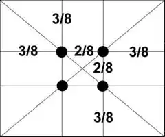 dl.htm за статьей «Философское обоснование понятия Золотая пропорция», впрочем, на наш взгляд, не особенно глубокой. Интересный пример использования золотого сечения для получения гармоничного фотоснимка приведен на страничке, посвященной фотоискусству www.photoline.ru/tcomp1.htm Он основан на подмеченном психологами и искусствоведами правиле - расположении основных компонентов кадра в особых точках - зрительных центрах. Таких точек всего четыре, и расположены они на расстоянии 3/8 и 5/8 от соответствующих краев плоскости. Человек всегда акцентирует свое внимание на этих точках, независимо от формата кадра или картины.