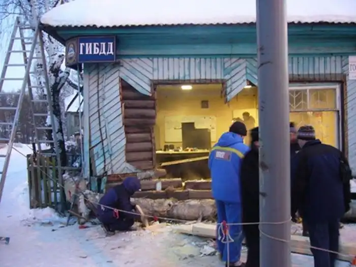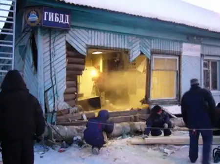 Вчера около 15.00 в здание отдела ГИБДД, расположенное на улице Востояной, 1, в Березовском (Свердловская обл.), на полном ходу врезался грузовик КрАЗ-250. За рулем машины находился житель Арамиля Сергей Теплоухов 1963 года рождения. В результате оказалась проломлена стена здания, в кабинете инспекторов вынесло окно. Также была повреждена теплотрасса, кипяток из которой хлынул внутрь здания. Чтобы горячая вода не затопила все помещения, трубу пришлось в экстренном порядке перекрывать. Грузовику же причинены незначительные повреждения.