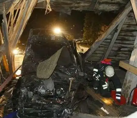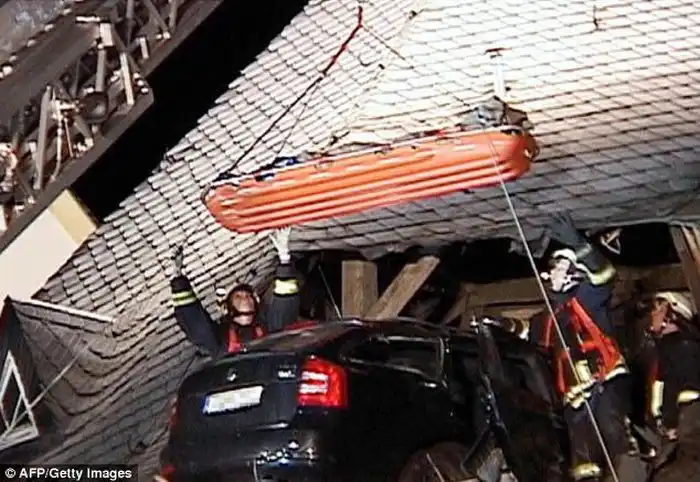 В городе Лимбах-Оберфрона 23-летний водитель на большой скорости не вписался в поворот, его вынесло за пределы дороги, он пролетел 30 метров по воздуху и застрял в крыше церкви на высоте 7 метров от земли. Парень жив, но в тяжелом состоянии.
