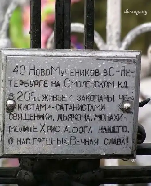 Одна из самых ужасающих легенд Смоленского кладбища (которую, кстати, многие ученые рассматривают не как легенду, а как исторический факт) - легенда о сорока заживо погребенных священниках. Вскоре после революции священников со всего города арестовали, привезли на Смоленское кладбище, выстроили на краю заранее вырытой огромной могилы и предложили либо отречься от веры, либо ложиться в землю заживо. Все священники предпочли мученическую смерть. Говорили, что еще в течение трех дней из могилы доносились стоны, а земля на этом месте шевелилась. Затем на могилу упал Божественный луч, и все затихло.