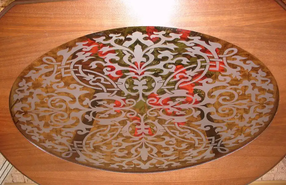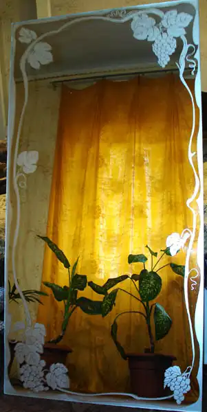 Это гораздо более совершенная технология, не оставляющая шероховатых поверхностей ( в отличии от пескоструя). Такой рисунок на стекле/зеркале не смывается и не стерается.