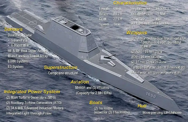 Проект эсминцев DDG-1000 Zumwalt, названный в честь бывшего министра ВМС США Элмо Зумволта, разрабатывался корпорацией Northrop Grumman с конца 90-х годов прошлого века. Водоизмещение корабля проекта составит около 14 тысяч тонн, скорость – более 30 узлов.