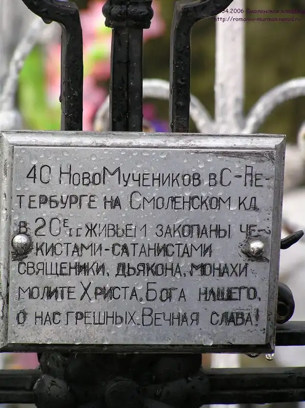 Одна из самых ужасающих легенд Смоленского кладбища (которую, кстати, многие ученые рассматривают не как легенду, а как исторический факт) - легенда о сорока заживо погребенных священниках. Вскоре после революции священников со всего города арестовали, привезли на Смоленское кладбище, выстроили на краю заранее вырытой огромной могилы и предложили либо отречься от веры, либо ложиться в землю заживо. Все священники предпочли мученическую смерть. Говорили, что еще в течение трех дней из могилы доносились стоны, а земля на этом месте шевелилась. Затем на могилу упал Божественный луч, и все затихло.