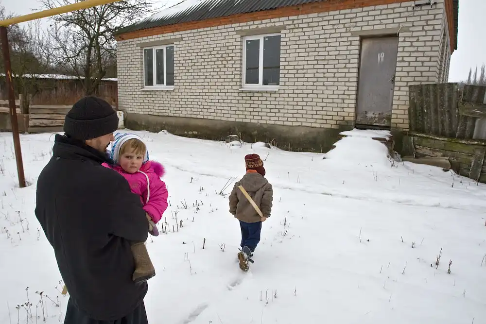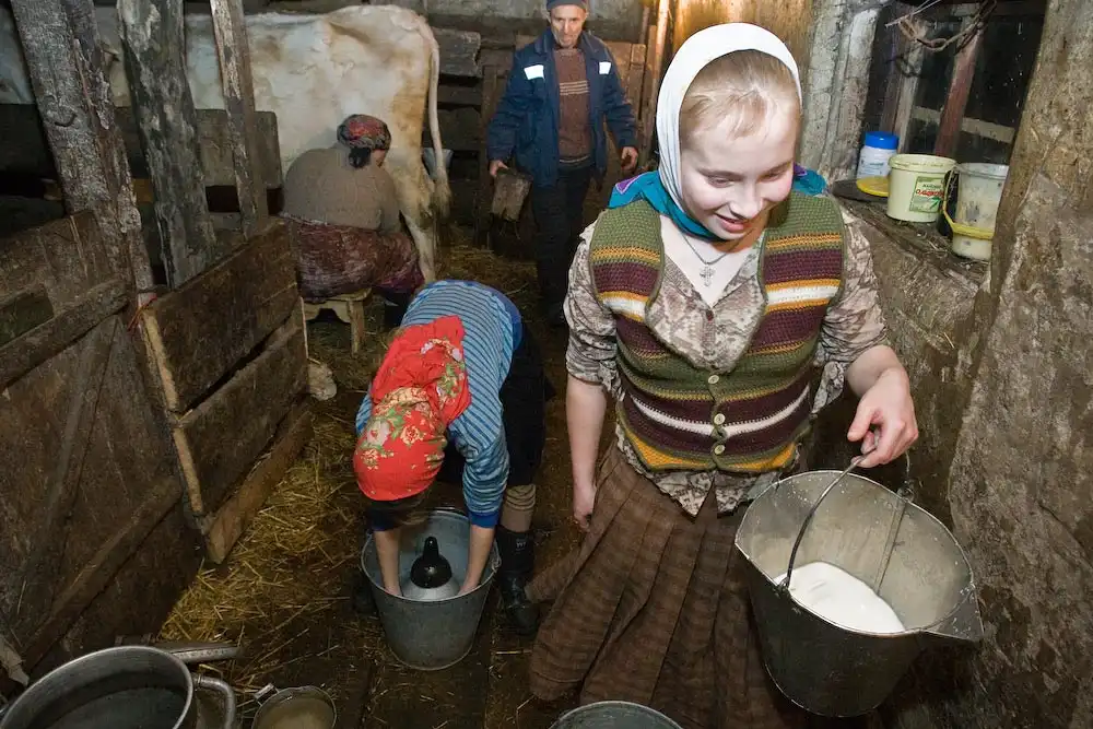 Домашний бюджет складывается из детских пособий, пенсий стариков и тех небольших денег, которые иногда остаются от приходской службы. Этого на большую семью не хватает, поэтому в доме живут своим хозяйством. Две коровы, телята, куры. Летом сажают картошку, которую потом весь год едят. Каждый день по два раза — дойка, в которой принимают участие старики и молодежь. На снимке: дедушка Коля доит Ждану.