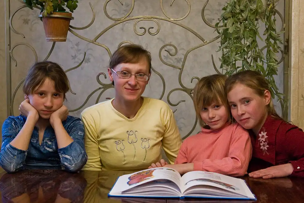 Чтобы маленькие заснули после обеда, мама читает им сказку.