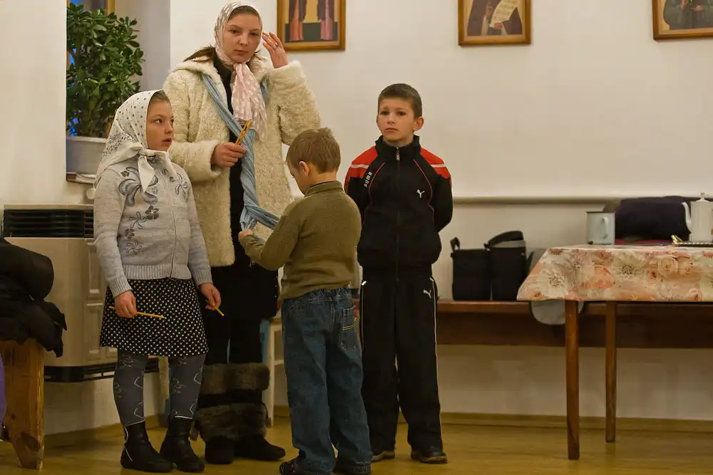 В пятницу я попал с корабля на бал — отец батюшки Николай Григорьевич привез меня с вокзала домой, а в церкви в это время уже шла служба. Туда мы и отправились с малышами и их мамой. Все дети, исключая маленьких Владика и Софию, помогают отцу вести службу. В тот день отец Владислав служил молебен святой Ксении Петербургской и девочки пели вместе с матушкой. София сидела то на скамейке, держась за руки Ксении, то у мамы на руках.