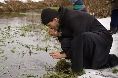Пока батюшка готовился, я натаскал воды из колодца для купели, разогрел чайник.