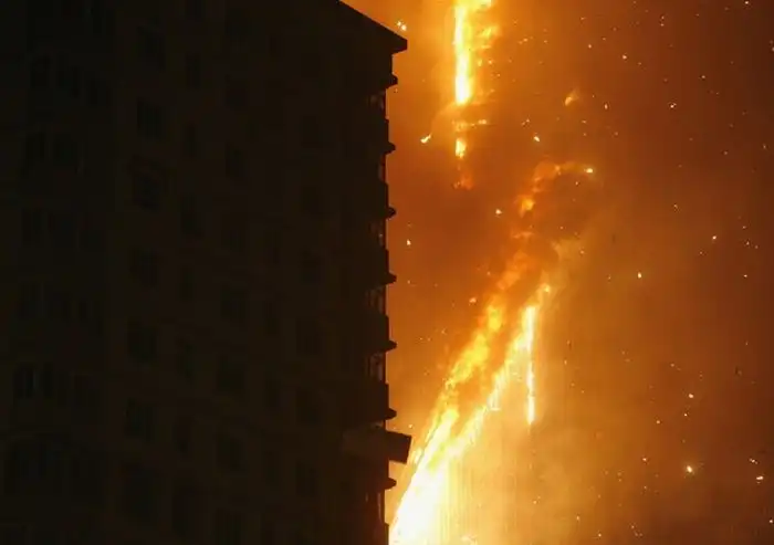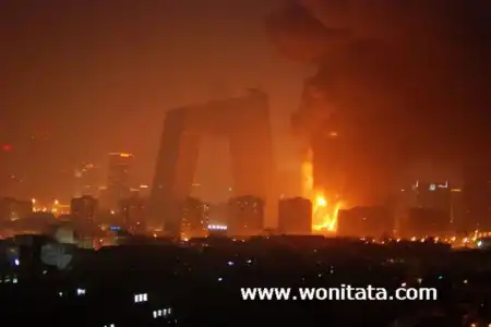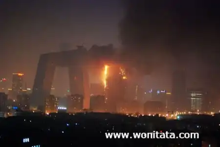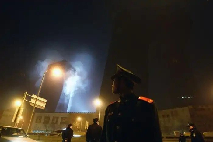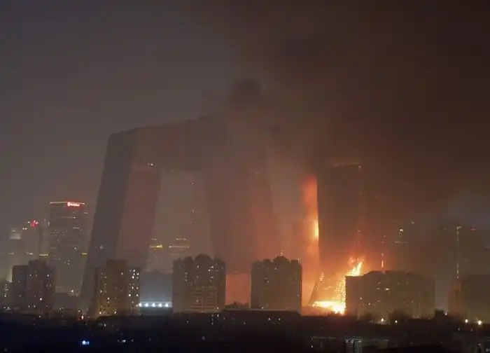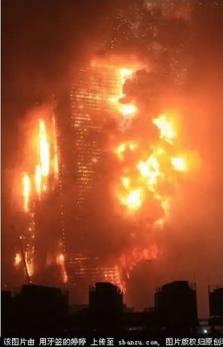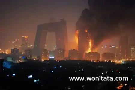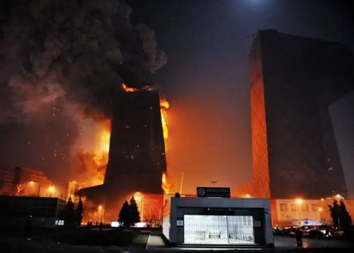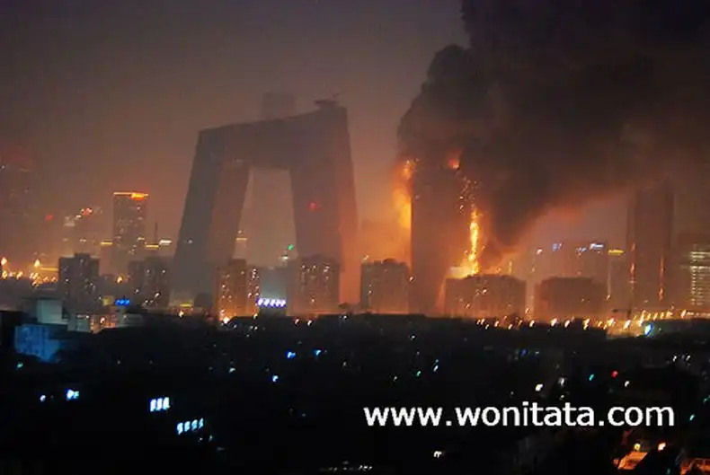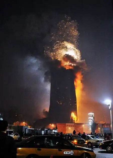 Одно из зданий Центрального телевидения, а именно 160-метровое здание, в котором должен было разместиться люкс-отель "Мандарин", загорелось вечером, во время празднования китайского Нового года. Это событие традиционно отмечается "с огоньком" - по всему городу поджигают фейерверки и взрывают хлопушки. Некоторые очевидцы утверждают, что пожар начался с крыши, куда стали падать фейерверки, затем огонь быстро распространился вниз. Сообщений о жертвах пока не поступало, но есть информация, что в здании в момент возгорания находились люди. Официальное открытие отеля было запланировано на лето.