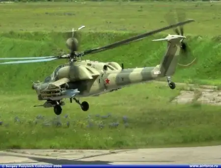 Кстати, несмотря на тяжелую броню, «Ми» крутится не хуже «Апача». Дело в том, что на маневренность винтокрылов сильно влияет величина разноса шарниров несущего винта: чем она больше, тем и маневренность выше. Так вот, разнос шарниров у «Апача» – 4%, а у «Ми» – 6%; его пятилопастный несущий винт более эффективен, чем четырехлопастный «индейца», особенно на малых скоростях; он успешно выполняет фигуры сложного пилотажа (петля Нестерова, бочка, иммельман), что важно для противоракетного маневра в бою; вследствие особой конструкции винтов и системы шумопоглощения полет его практически бесшумен; уровень вибрации у него тоже меньше, что важно при прицеливании.