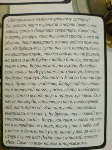 "Запорожские казаки турецкому султану! Ти, султан, чорт турецкий, i проклятого чорта брат i товарищ, самого Люцеперя секретарь. Якiй ты в чорта лыцарь, коли голою сракою ежака не вбъешь. Чорт высирае, а твое вiйско пожирае. Не будешь ты, сукiн ты сыну, сынiв христiянських пiд собой маты, твойого вiйска мы не боiмось, землею i водою будемо битися з тобою, распро#б твою мать. Вавилоньский ты кухарь, Макидоньский колесник, Iерусалимський бравирник, Александрiйський козолуп, Великого и Малого Египта свинарь, Армянська злодиюка, Татарський сагайдак, Каменецкий кат, у всього свiту i пiдсвiту блазень, самого гаспида внук и нашего х$я крюк. Свиняча ты морда, кобыляча срака, рiзницька собака, нехрещений лоб, мать твою въ#б. От так тобi запорожцi виcказали, плюгавче. Не будешь ти i свиней христiанских пасти. Теперь кончаемо, бо числа не знаемо i календаря не маемо, мiсяц у небi, год у кнызи, а день такий у нас, який i у Вас, за це поцелуй в сраку нас!