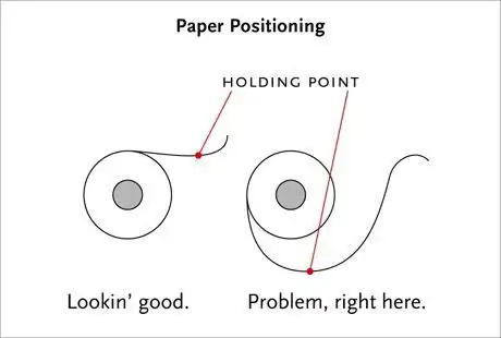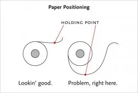 Для непонятливых поясню: чтобы получилось грамотно оторвать кусок бумаги по линии отрыва при помощи одной руки, нужно чтобы рулон был раскручен сверху, иначе не видно линии отрыва и бумага просто раскрутиться метра на 2 и будет до пола свисать (такое свинство часто можно увидеть).