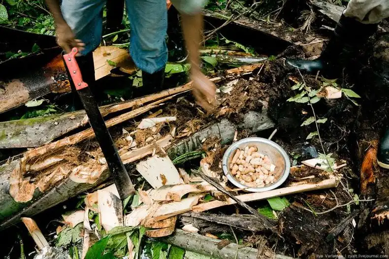 Гуляя по заболоченным джунглям обратите внимание на упавшие пальмы. Это отличное место где можно поживиться гигантскими личинками! Сочные и мягкие личинки ждут вас в перегнивающих, теплых внутренностях пальмы. Срезав верхний твердый слой, опустите руки в теплую гниющую массу ствола и нащупав шевелящиеся комочки , доставайте их. Если не появилось лапок, то личинку можно сразу разрывать и высасывать пульсирующие внутренности.