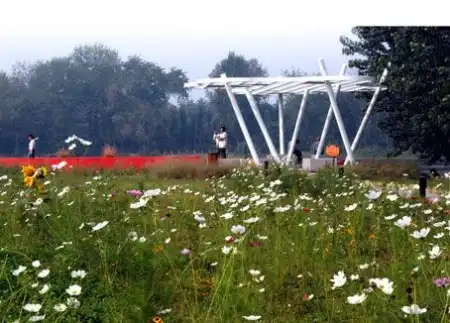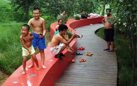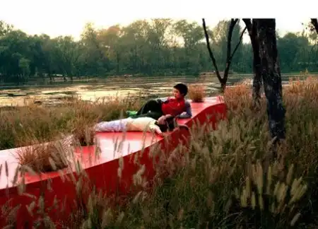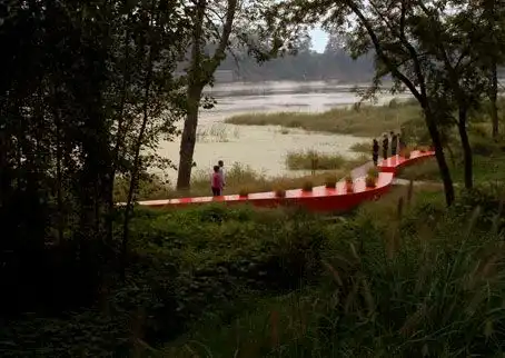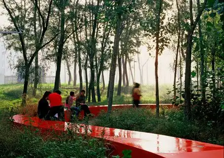 В одном из парков Китая, вдоль берега пролегающей там реки, расположилась красная стальная скамейка длиной в 500 метров. Высота скамейки составляет 60 см, а ширина варьируется от 30 до 150 см. Вечером она излучает красное свечение при помощи вмонтированных ламп, что позволяет там находиться даже в сумерки; также вдоль скамейки расположены несколько беседок, позволяющих отдыхающим укрыться в случае непогоды. Такое необычное архитектурное сооружение органично вписалось в природный ландшафт за счет того, что прямо сквозь её поверхность проростают кустарники и растения.