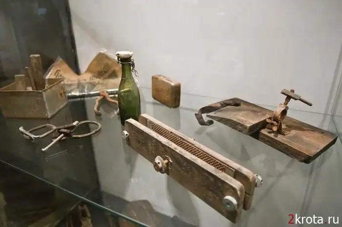 В этом устройстве зажимали пальцы, выдирали ногти. Машинка аутентичная — после освобождения города от немцев всё оборудование пыточных камер осталось на своих местах и было сохранено.