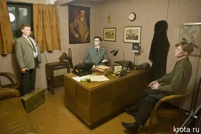 Это реконструкция допроса — гестаповский провокатор (слева) предъявляет арестованному радисту подпольной группы (он сидит справа, в наручниках) его радиостанцию в чемодане. В центре сидит шеф кристиансандского гестапо, гауптштурмфюрер СС Рудольф Кернер